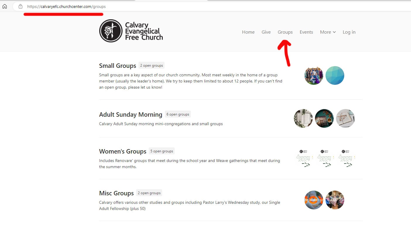 But some group settings are not available, please contact Gail Peterson at gpeterson@calvaryefree.church if you want to do things like create, list, make private or close a group.