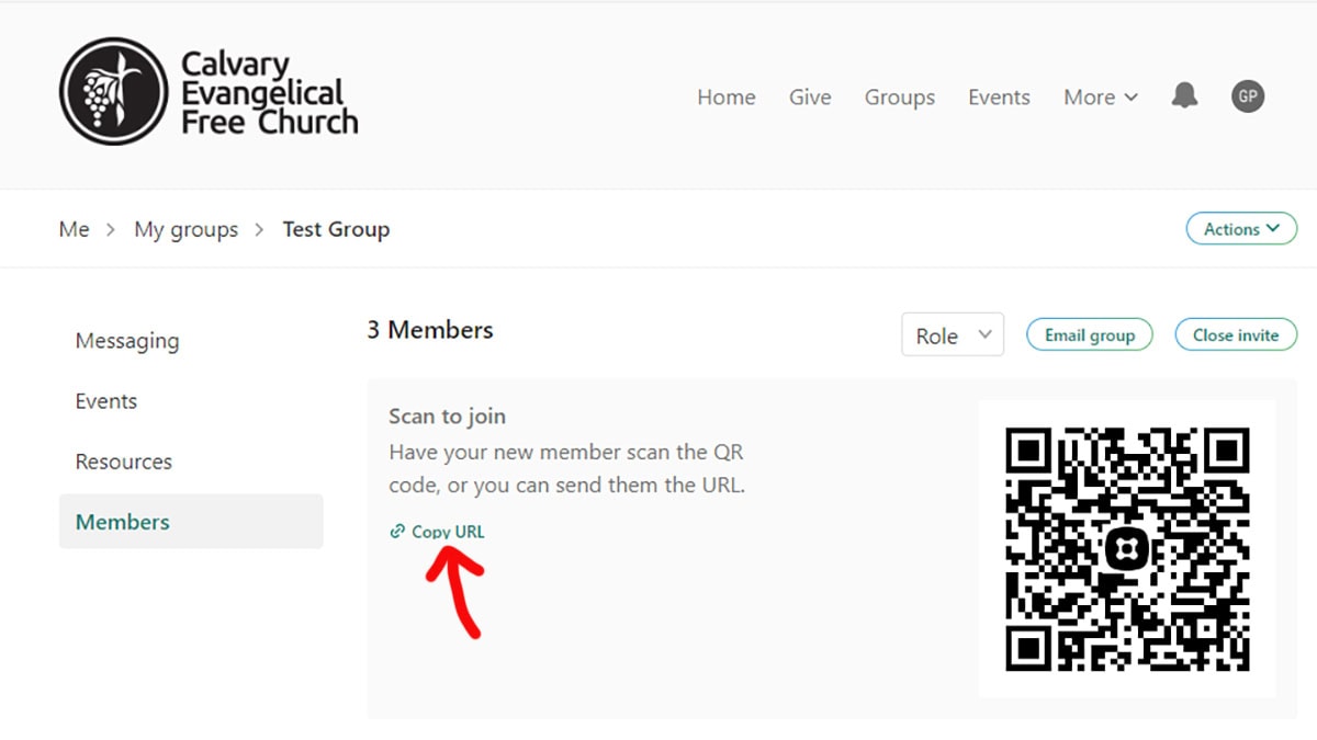 - Select the “Members” menu item and then the “+ Add Member” button. Then select the “Copy URL” link and then compose an email to the new group member inviting them to the group. Remember to paste the invite url into your email.