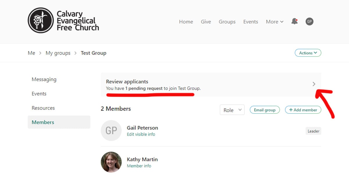 - Lastly you can direct them to go to https://calvaryefc.churchcenter.com/groups and search for your group if it is listed and select the “Request to Join” button. Then as a leader you will get an email asking you to approve their request to join the group.