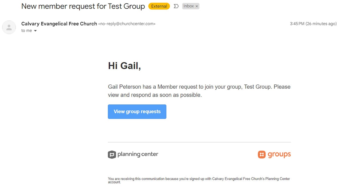 - As the leader of the group, you will get an email asking you to approve their request to join the group which will redirect you to the Orange header groups Planning Center web page and ask you to login to accept the request. You can also accept the request by logging into church center and viewing your group “Members” page.